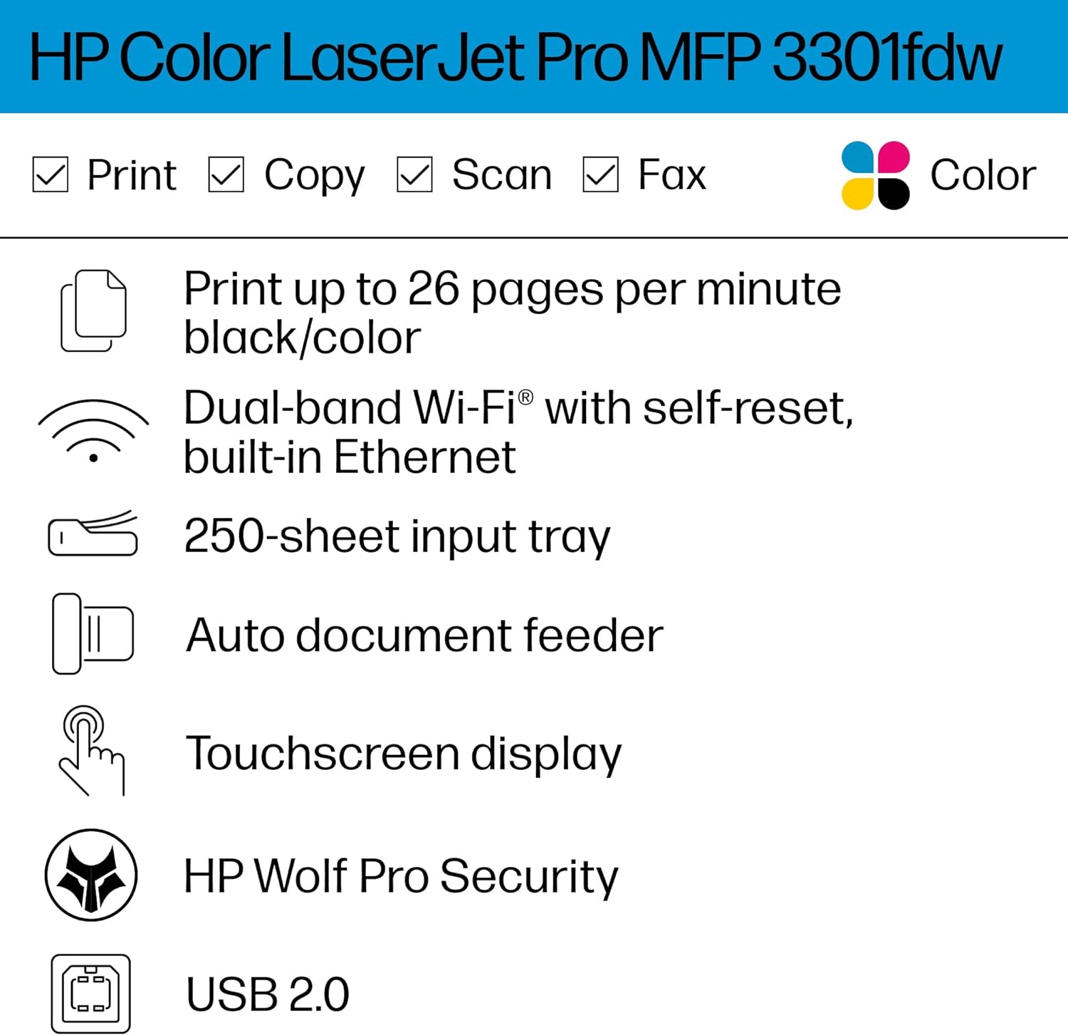 Ideal for offices, get vibrant laser-quality color and powerful productivity with the Color LaserJet Pro MFP 3301fdw. This all-in-one color laser printer is loaded with features and incredible speed perfect for offices. Print, scan and copy from anywhere with HP app. Connect via wireless or ethernet with the 3301fdw, an mfp that has built-in Wi-Fi® and HP Wolf Pro to keep your information secure.